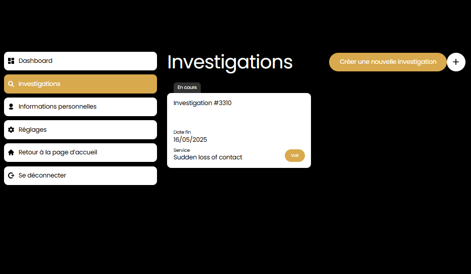 Une fois connecté, accédez à la section « Investigations », puis cliquez sur « Créer une nouvelle investigation ».